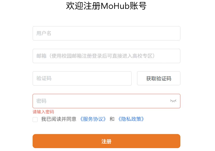 进入Mohub网站(https://mohub.net/home),使用个人邮箱或校园邮箱注册为Mohub用户,随后使用个人用户名或者邮箱和密码进行登录;